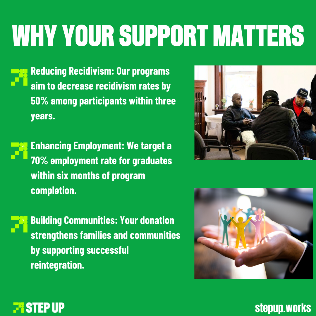 Step Up Works is committed to empowering justice-impacted individuals by providing essential transportation and housing services. We're aiming to raise $40,000 to launch our Wheels of Opportunity program, which is crucial for increasing job retention rates by 40%. This initiative will ensure our community members can attend mandatory appointments, work, school, and other personal and professional development opportunities. Your support can make a significant difference in breaking the cycle of recidivism and building brighter futures.